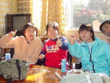 ![]() 演奏後、只今お弁当中!写真左から 田所由佳理、星晴奈、小泉香織、顔半分は香織父 |