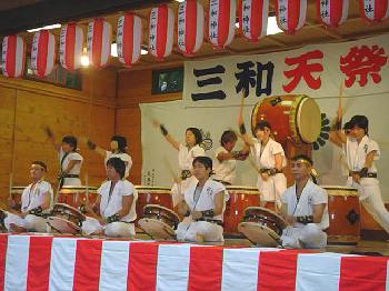 | 毎年行われている小川町の郷土芸能で五穀豊穣を願う「三和天祭り」に招かれ出演した。 あいにくの小雨の中、また、狭い舞台のため少数精鋭となったが、我々の熱演にたくさんの拍手をいただいた。 関係者のみなさん、そしてご来場のみなさんありがとうございました。 |